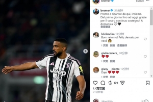 布雷默社媒晒出比赛照片,庆祝复出,他写道:“准备好从这里与大家一起重新出发。”