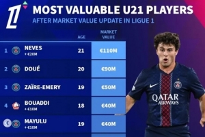 德转列法甲U21身价榜:内维斯压杜埃居首,布阿迪、马尤卢在列