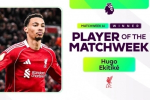 体育资讯12月17日讯 英超官方消息,利物浦前锋埃基蒂克被评为联赛第16轮最佳球员。