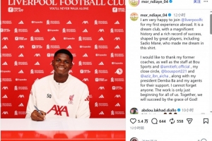 恩迪亚耶写道:“我非常高兴能加入利物浦俱乐部,开启我首次海外效力经历。这是一家梦想中的俱乐部,拥有辉煌的历史和丰厚的成功底蕴,由众多伟大球员塑造而成,其中包括马内,正是他让我怀揣穿上这身球衣的梦想。
