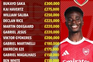 萨卡30万镑顶薪!阿森纳周薪:赖斯22.5万、马杜埃凯5万、道曼350