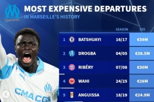 马赛队史最贵转出榜:巴舒亚伊、德罗巴、里贝里前三,瓦斯第8