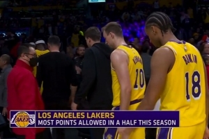 上半场,残阵湖人让对手轰下84分,创下球队本赛季半场失分纪录。